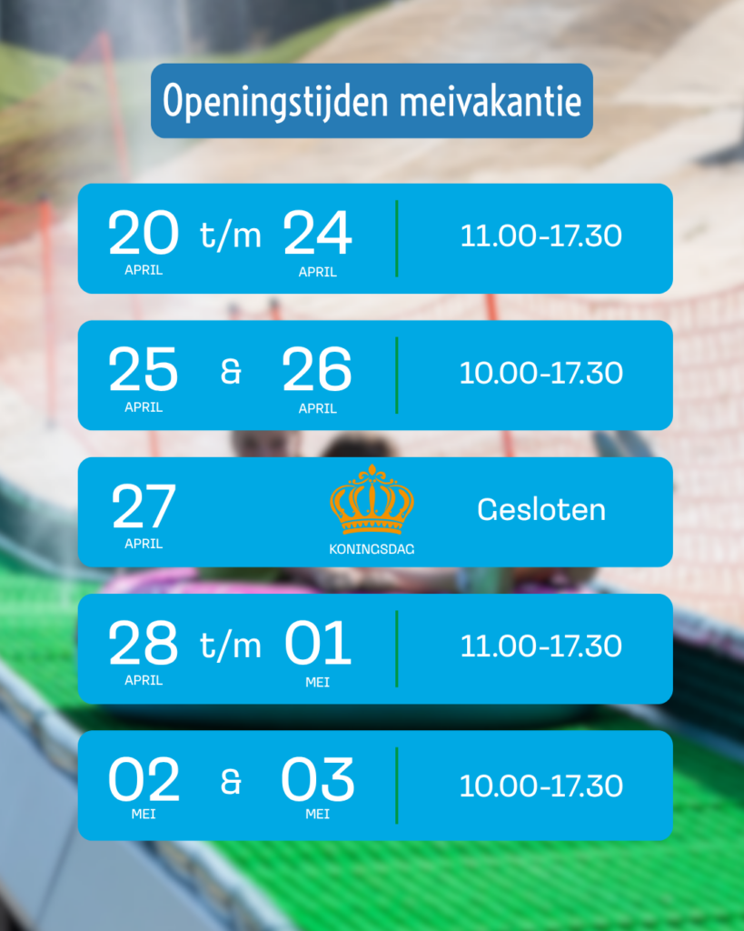 In maart zijn we nog geopend voor privé-lessen of vrij skiën/snowboarden, vanaf april gaan onze zomeractiviteiten weer van start! Klik hier voor de openingstijden.